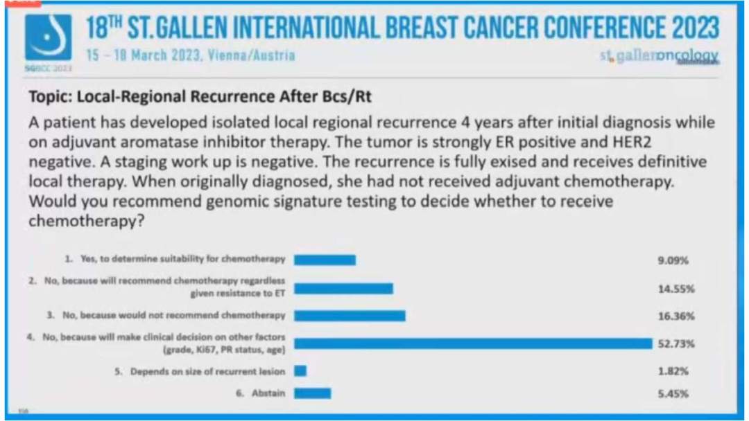(6)一名患者在初诊后4年出现孤立性局部区域复发,同时接受芳香化酶抑制剂辅助治疗。肿瘤为ER+/HER2-。分期检查为阴性。复发完全存在并接受明确的局部治疗。最初诊断时,她没有接受辅助化疗。您是否会推荐基因组检测以决定是否进行化疗?
