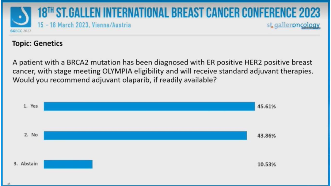 (9)具有BRCA2突变的患者已被诊断为ER+/HER2+乳腺癌,分期符合OLYMPIA资格,并将接受标准辅助治疗。如果药物可及,您会推荐奥拉帕利辅助治疗吗?