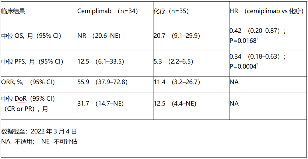 cemiplimab组(n=34)相比化疗组(n=35)延长了中位总生存(OS),分别为未达到(NR)vs 20.7个月(风险比<hr/>=0.42;95%可信区间[CI]:0.20-0.87;p=0.0168);