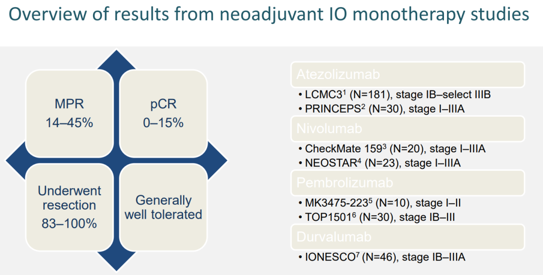 这项报告回顾了在早期非小细胞肺癌(NSCLC)患者中开展的新辅助免疫单药治疗和新辅助免疫联合化疗的研究结果。新辅助免疫单药研究包括阿替利珠单抗LCMC3研究和PRINCEPS研究;纳武利尤单抗CheckMate 159研究和在IB–IIIA患者中评估新辅助纳武利尤单抗+伊匹木单抗以及新辅助纳武利尤单抗单药治疗的NEOSTAR研究;帕博利珠单抗MK3475-223研究和OP1501研究;度伐利尤单抗的IONESCO研究等。综合这些研究的数据,单用新辅助免疫治疗的主要病理缓解率(MPR)为14%~45%,病理学完全缓解率(pCR)为0%~15%,接受手术切除的患者占83%~100%,这些新辅助治疗方案一般耐受性良好。