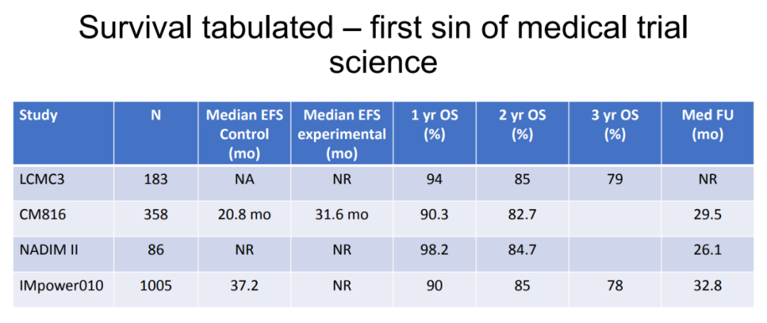 Egbert F.Smit认为的确存在这种情况,但对前两个问题的担忧是没有真实依据的,相关证据主要是来自II期研究。Dr.Smit指出:“潜在可切除NSCLC因为发生疾病进展而没有进行手术切除,这可能取决于患者就诊时的疾病分期。在III期CheckMate 816研究中,约5%的IB期患者未接受手术切除,而III期患者未接受手术的比例约为8%。换句话说,患者就诊时或被纳入试验时的疾病分期越晚,疾病进展的可能性越大。我们需要考虑的是,辅助化疗/免疫治疗试验在不同时间点入组患者,这些试验纳入了已经接受R0切除的患者,但是这些试验没有说明多少患者未被纳入试验是因为手术前就已经有疾病进展,也没有说明有多少患者术后因疾病进展而未完成计划的化疗,以及有多少患者在化疗后因疾病进展而未接受免疫治疗?在IMpower010研究中,保守估计有6.5%的患者由于疾病进展而没有被随机分组(接受免疫治疗或最佳支持治疗)。这些辅助化疗/免疫试验与新辅助化疗/免疫试验或辅助免疫单药试验有相同的问题。”