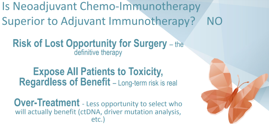 可能的过度治疗:选择真正获益人群的机会较少(需要ctDNA、驱动突变分析等)。Dr.Wakelee强调了检测驱动基因突变的重要性,而不是让患者匆忙接受新辅助治疗,从而避免让可能不会获益的患者接受这种治疗。