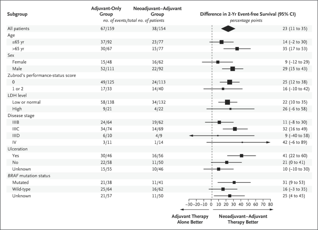 研究纳入了313例符合条件的黑色素瘤患者,其中154例患者被分配至新辅助-辅助治疗组,159例在单纯辅助治疗组。经过14.7个月的中位随访期,共有105例事件发生,其中新辅助-辅助治疗组38例,辅助治疗组67例。相较于单纯辅助治疗组,新辅助-辅助治疗组的EFS显著延长(HR 0.58,95%CI 0.39–0.87;P=0.004);新辅助-辅助治疗组患者的2年EFS率为72%(95%CI:64%-80%),单纯辅助治疗组为49%(95%CI:41%-59%)。在接受新辅助治疗的可评估患者中,分别有6%和41%达到CR和PR;当地机构病理学评估的pCR为21%;大多数患者(127/144,88%)接受了根治性手术。安全性方面,新辅助-辅助治疗组3级及以上相关不良事件发生率为12%,单纯辅助治疗组为14%,且没有发现新的毒性。