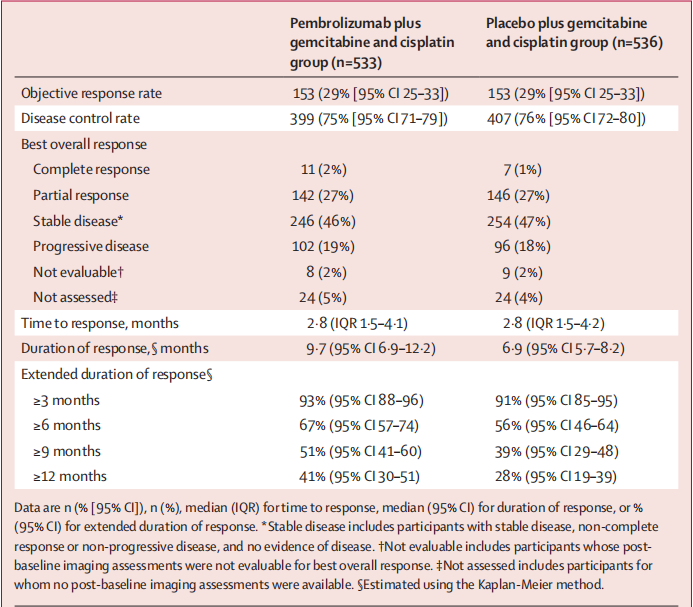 在第一次中期分析中,帕博利珠单抗联合化疗组和安慰剂联合化疗组的ORR均为29%。帕博利珠单抗联合化疗组中,完全缓解率为2%,部分缓解率为27%;而在安慰剂联合化疗组,完全缓解率为1%,部分缓解率为27%(表1)。