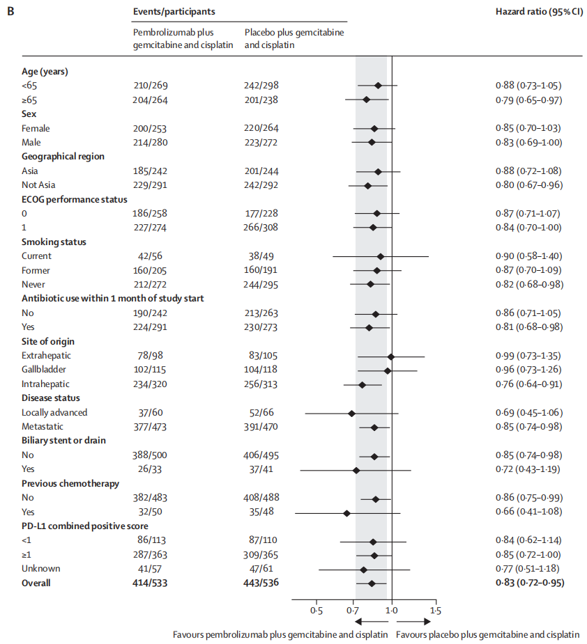 按如下因素进行分层:地理区域(亚洲vs.非亚洲)、疾病分期(局部晚期vs转移性)和起源部位(肝外胆管癌vs.胆囊vs.肝内胆管癌)。