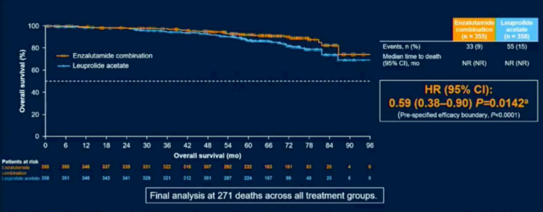 OS数据尚未成熟,但已经观察到恩扎卢胺联合组的死亡风险降低41%(HR 0.59,95%CI:0.38~0.90,P=0.0142),尚未达到预设的效能界值(P<0.0001)。