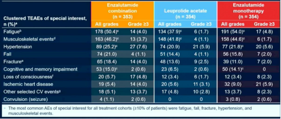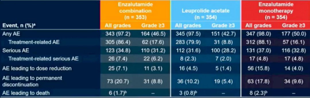 恩扎卢胺联合组没有观察到新的安全性信号。三组中有43%~50%的患者出现3级或更严重的AE。与恩扎鲁胺联合用药(32个月)和亮丙瑞林(35个月)相比,恩扎鲁胺单药治疗的中位治疗持续时间最长(46个月)。