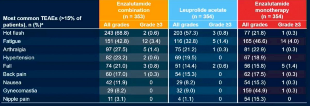 导致停药的最常见AE是疲劳(恩扎鲁胺联合组为3%,亮丙瑞林和恩扎鲁胺单药治疗组分别为1%和2%)。总体而言,所有治疗组中最常见(>15%)的AE是热潮红和疲劳。