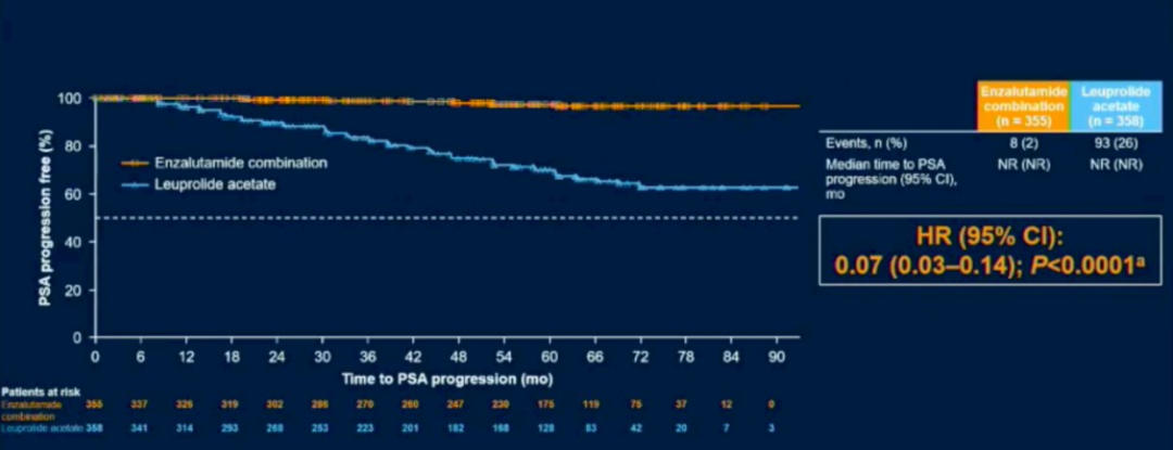 至PSA进展时间也显示恩扎卢胺联合组的获益,进展风险降低93%(HR仅为0.07,95%CI:0.03~0.14,P<0.0001),联合组的KM曲线保持平坦,PSA进展事件仅有8例。