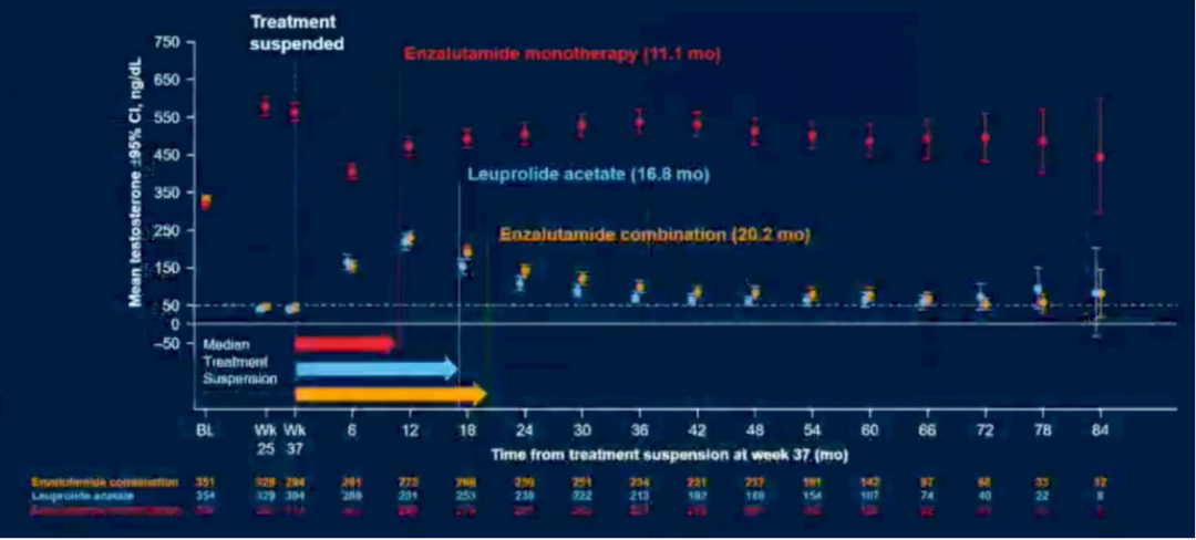 恩扎卢胺联合组、亮丙瑞林组、恩扎卢胺组36周时PSA<0.2 ng/mL的患者比例分别为90.0%、67.8%和85.9%,中位治疗暂停时间分别为20.2个月、16.8个月和11.1个月。可见恩扎卢胺联合组有更高比例的PSA控制以及更长时间的停药。