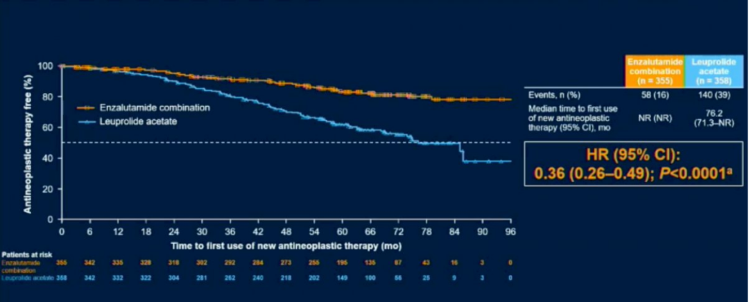 至首次使用新抗肿瘤治疗的时间方面,恩扎卢胺联合组也有显著延长(HR 0.36,95%CI:0.26~0.49,P<0.0001)。