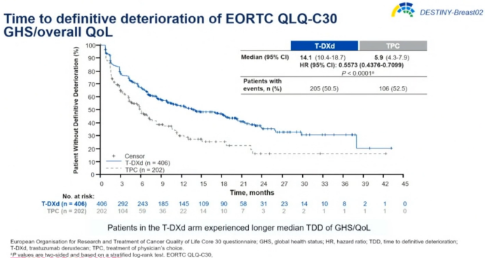 该研究结果表明了与医生选择的化疗(TPC)相比,T-DXd能为患者带来了更好的生活质量,且接受T-DXd治疗的患者生活质量至明确恶化时间也被延缓了。更具体来讲,T-DXd组的患者总体健康状况、整体生活质量、身体机能和疼痛症状方面至明确恶化的时间要比医生选择化疗的患者晚。DESTINY-Breast02研究和患者报告结局数据验证了T-DXd对T-DM1耐药且HER2阳性的转移性乳腺癌患者的获益。