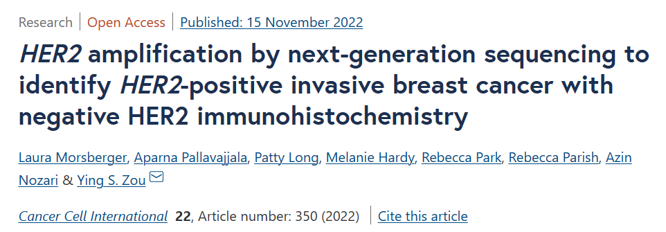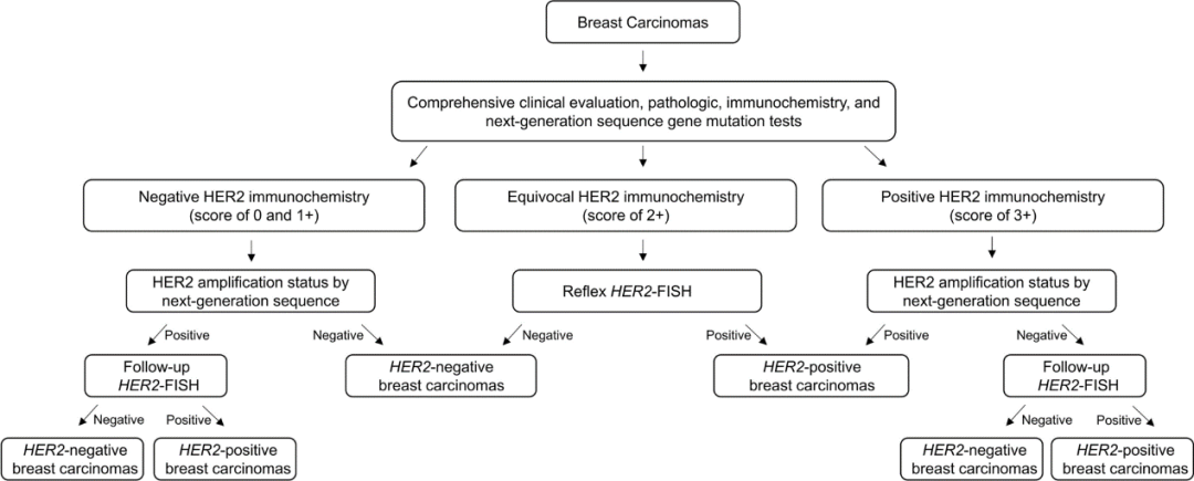 编者按:人表皮生长因子受体2(HER2)阳性乳腺癌侵袭性较强,与不良预后相关;准确识别乳腺癌HER2扩增状态并使用抗HER2靶向治疗,具有重要的诊断和治疗价值。虽然少部分HER2 IHC阴性(IHC 0和1+)患者的HER2 FISH检测为阳性;但在日常临床实践中,对HER2 IHC阴性患者全部进行HER2 FISH检测,不可行且费用较高。随着生物统计学分析快速发展,下一代测序(NGS)能够同时检测体细胞突变和HER2扩增状态,为乳腺癌患者提供了更全面的基因分析。