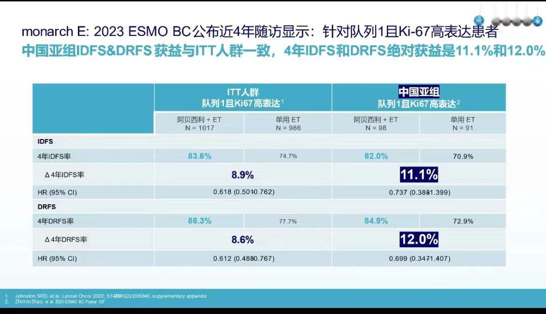 3.Zhimin S,et al.Results in Chinese patients from pre-planned overall survival interim analysis in monarchE:abemaciclib plus adjuvant endocrine therapy for high risk HR+,HER2-early breast cancer.2023ESMO BC Abstract#107P