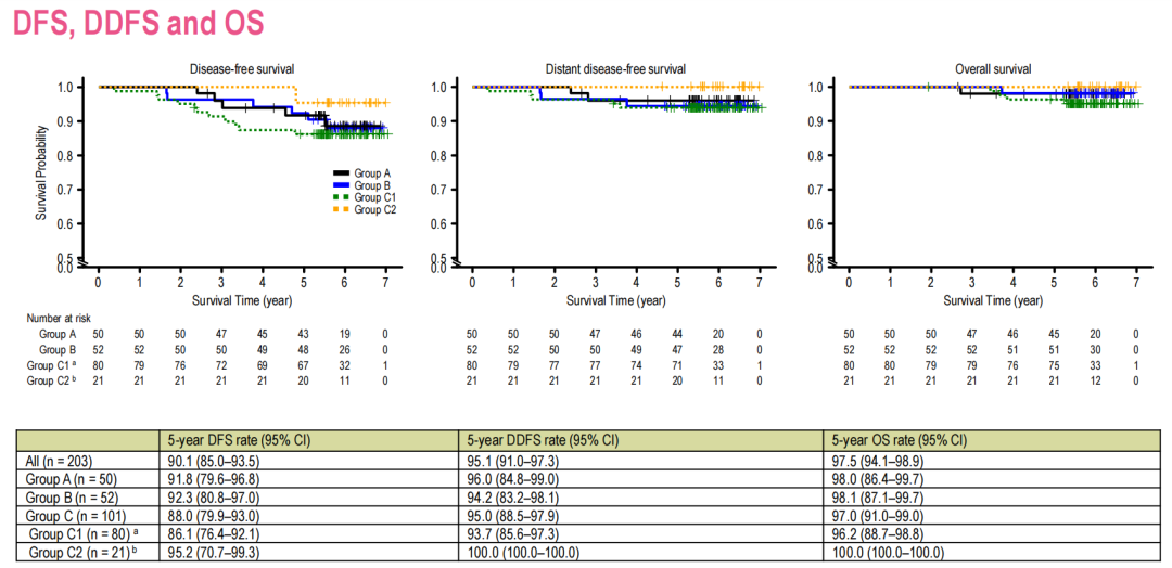 2023年ESMO BC报道了该研究的5年DFS、DDFS和OS等远期生存结果。A、B、C三组的5y-DFS率分别是91.8%、92.3%和88.0%(其中C1组86.1%、C2组95.2%);5y-DDFS率分别是96.0%、94.2%和95.0%(其中C1组93.7%、C2组100.0%);5y-OS率分别是98.0%、98.1%和97.0%(其中C1组96.2%、C2组100.0%)。结果显示,虽然B组的pCR率有较高趋势,但各组的总体预后均良好。