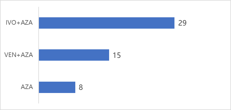 148例患者随机分组,73例接受IVO+AZA治疗,75接受PBO+AZA治疗。IVO+AZA组的中位治疗持续时间为10.8个月,PBO+AZA组为3.2个月。5例PBO+AZA患者在2021年3月后交叉至IVO+AZA,在更新的OS分析中,未对交叉进行校正。