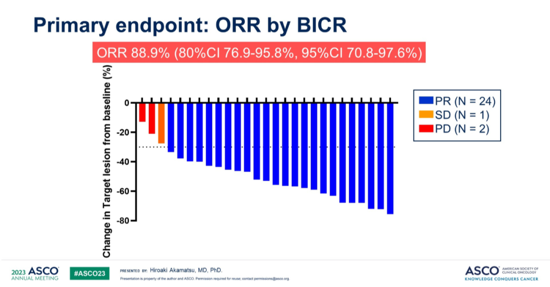 主要终点ORR为88.9% (80%CI: 76.9-95.8%,95%CI: 70.8-97.6%)。BICR和研究者评估的中位PFS分别为5.7个月和7.6个月,6个月PFS率分别为49.6%和56.7%。OS数据尚未成熟。