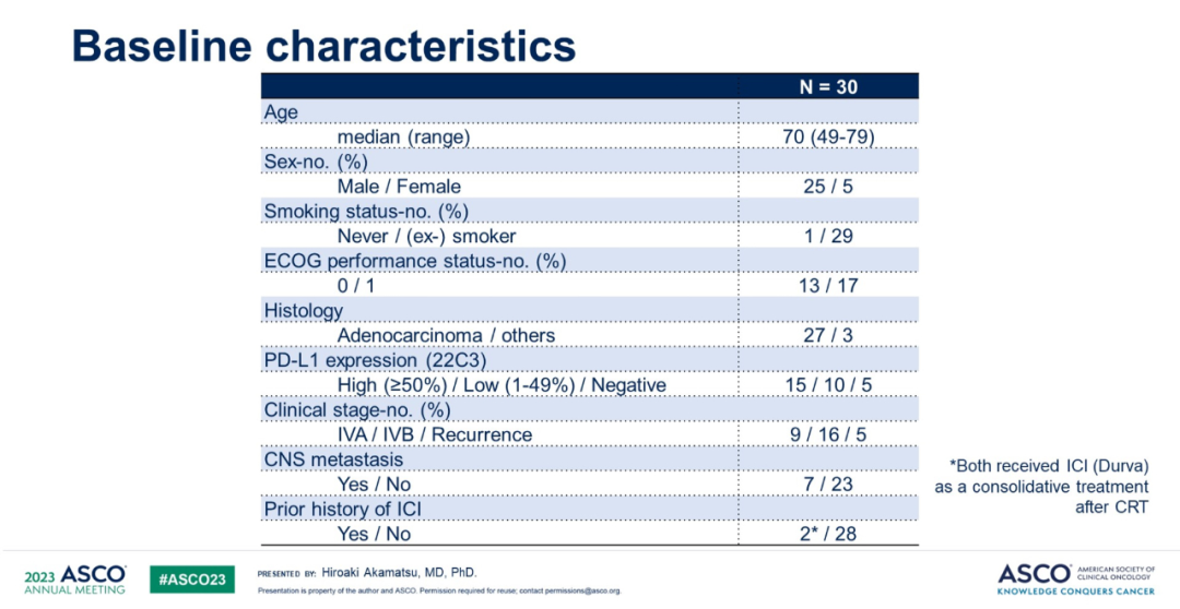 研究在2021年10月至2022年7月期间入组30名患者。分别对29例和27例进行安全性和有效性分析。患者的中位年龄70岁,男女患者分别为25例和5例,从不吸烟者和吸烟者分别有1例和29例。ECOG体能状态(PS)0分和1分的患者分别有13例和17例。PD-L1表达水平≥50%、1-49%和<1%的患者分别有15例、10例和5例。IVA、IVB和复发患者分别有9、16和5例。腺癌患者27例,7例患者伴CNS转移,2例患者接受过ICI治疗。