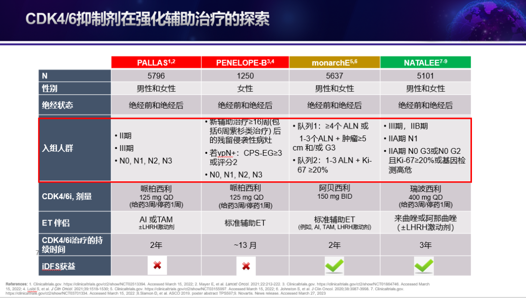 近年来CDK4/6抑制剂为该类患者带来了新的选择。国外目前共有3款用于乳腺癌治疗的CDK4/6抑制剂上市:哌柏西利、阿贝西利、瑞波西利,在晚期乳腺癌治疗领域取得了非常优异的成绩的同时,我们也看到这三款CDK4/6抑制剂在EBC强化辅助治疗的持续探索。然而,不同CDK4/6抑制剂的强化辅助治疗结果不一致,例如PENELOPE-B研究和PALLAS研究中,哌柏西利联合内分泌辅助治疗并没有显著改善患者的IDFS获益,目前看到阳性结果是阿贝西利monarchE(5637例)研究及在ASCO上公布结果的瑞波西利NATALEE研究(5101例)。