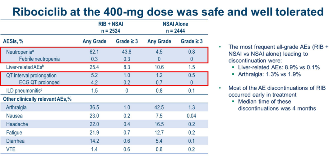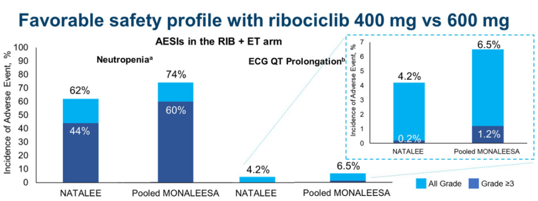 本届大会上,研究者对NATALEE研究中瑞波西利400mg与MONALEESA系列研究分析中瑞波西利600mg的安全性进行了比较。NATALEE研究中瑞波西利的主要不良反应为中性粒细胞减少和Q-T间期延长,与MONALEESA系列研究中起始剂量600mg的瑞波西利相比,显示了出较低的剂量毒性(≥3级中性粒细胞减少发生率:43.8%vs 60%;EGC Q-T间期延长发生率:0.2%vs 1.2%)。
