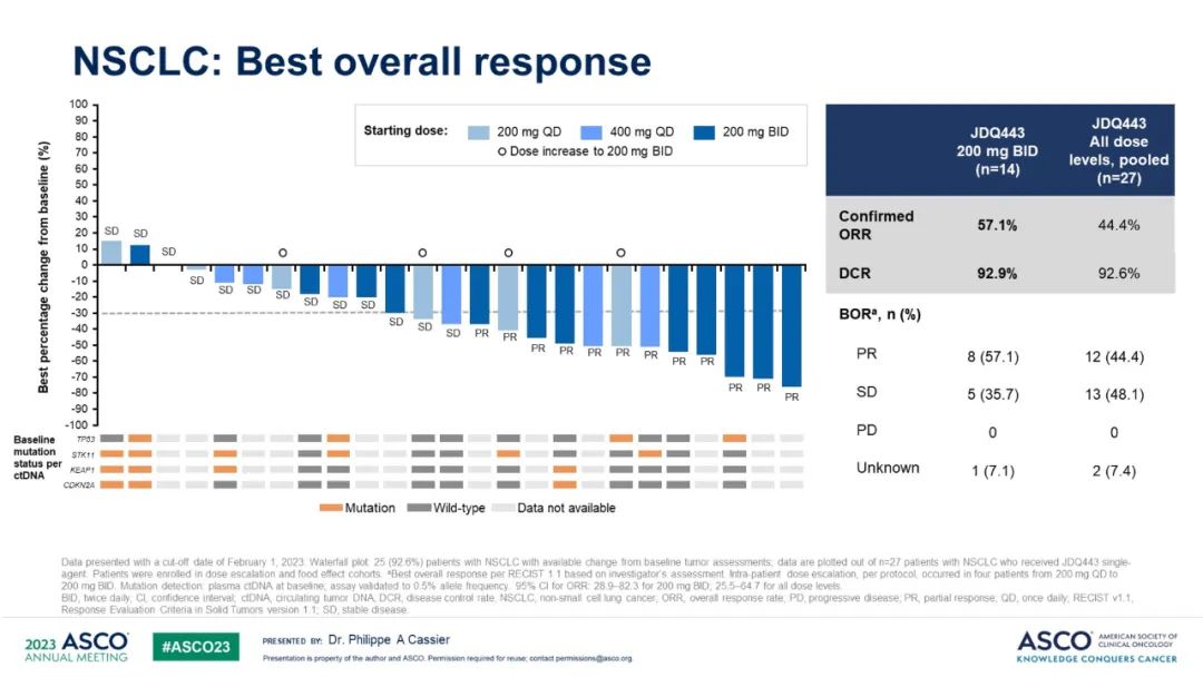 在疗效方面,JDQ443的推荐II 期剂量为200 mg,每日两次,半衰期约为 7小时(因此可能每天服用3次,但临床实践中很难做到这一点),到目前为止的疗效数据非常好,在KontRASt-01试验200mg BID剂量组的14名患者中,经确认的客观缓解率(ORR)为57.1% ,令人印象深刻;在所有剂量组,JDQ443的ORR约为44.4%,这一数据与adagrasib和sotorasib研究中的ORR数据更一致。