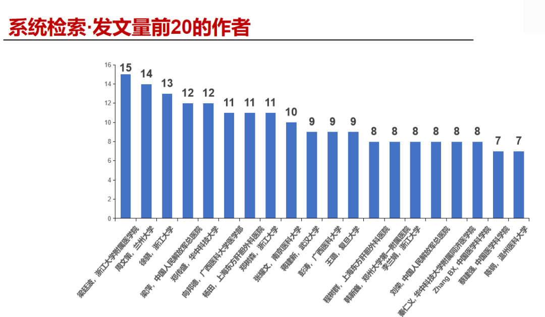 中国临床肿瘤学会青年专家委员会肝胆胰小组对发文量前20的研究机构、发文量前20的作者、发文量前20的杂志进行了分析,并通过统计图进行了展示(见下图)。