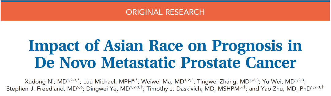 ?2023年7月12日,复旦大学附属肿瘤医院叶定伟教授领衔的国际多中心团队在美国国立综合癌症网络(NCCN)官方杂志Journal of the National Comprehensive Cancer Network在线发表了题为“亚洲人种对新发转移性前列腺癌预后的影响”的文章,通过分析前列腺癌多中心数据库的27 041例患者的长期随访数据,在国际上首次报道了黄白人种间新发转移性前列腺癌的显著预后差异。复旦大学附属肿瘤医院泌尿外科叶定伟教授、朱耀教授为该论文通讯作者,洛杉矶西达赛奈医疗中心Timothy J Daskivich教授为共同通讯作者,泌尿外科八年制博士倪旭栋是第一作者。