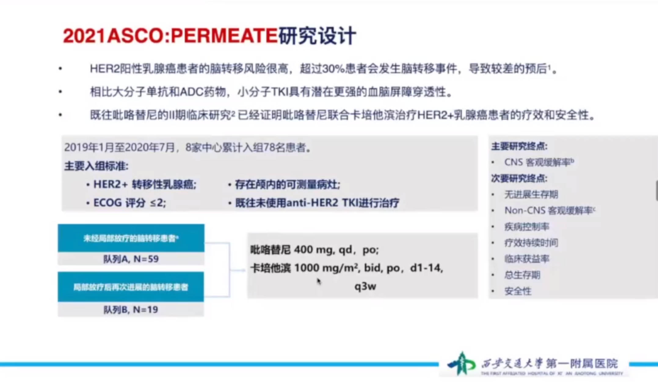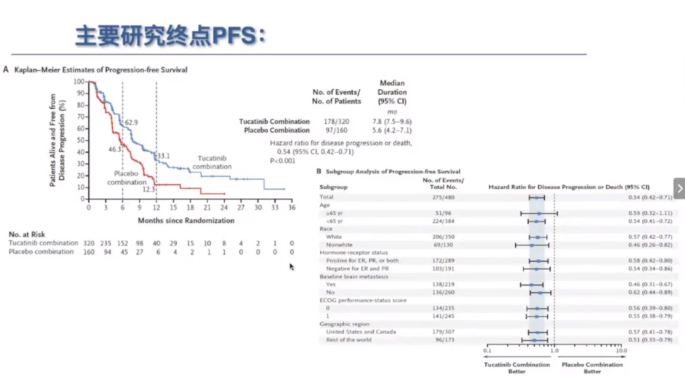 在研究过程中,对CNS局部进展的患者予以局部治疗后继续使用原方案显示,图卡替尼组vs对照组的PFS2为7.6个月vs 3.1个月,提示不更换的方案的潜在获益。