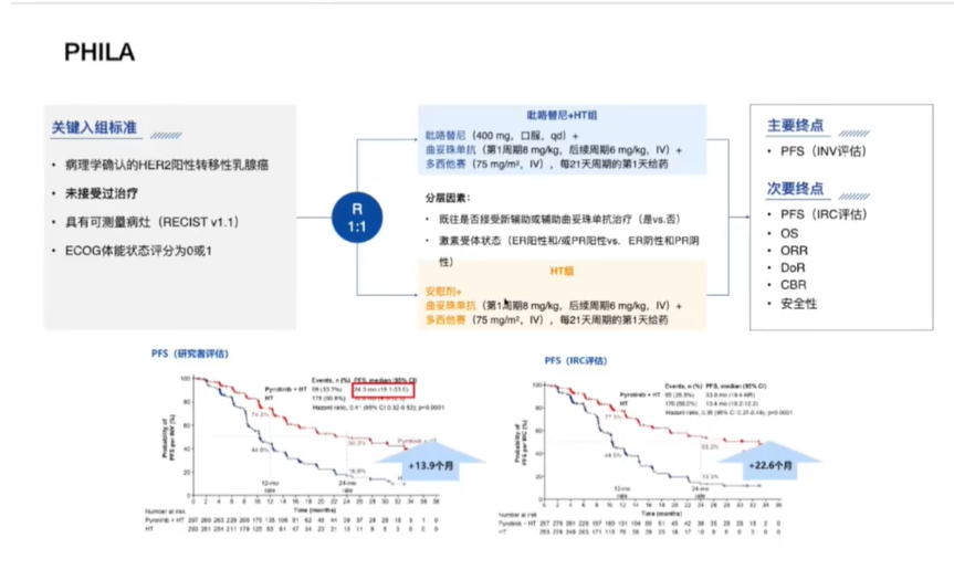 上述研究展现了图卡替尼在后线治疗的效果,在一线治疗中,PHILA研究显示吡咯替尼+曲妥珠单抗+多西他赛较曲妥珠单抗+多西他赛改善了PFS,为图卡替尼向前线进发提供一定的参考。目前HER2CLIMB-05研究正在探索图卡替尼或安慰剂联合曲妥珠单抗和帕妥珠单抗维持治疗晚期HER2阳性乳腺癌的效果。