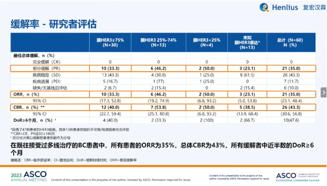 研究纳入了60例晚期经治的激素受体阳性或三阴性乳腺癌患者,予以HER3-DXd中位治疗5.2个月,结果显示,所有患者ORR为35%,疾病控制率(CBR)为43%。