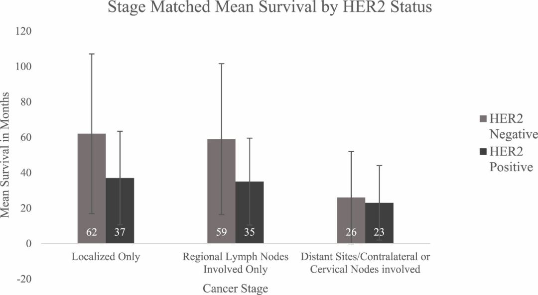 HER2阳性男性乳腺癌患者更有可能接受化疗(68%vs 33%,P<0.001)。研究组间的放射治疗管理相似。全身治疗和手术联合治疗也存在显著差异。与HER2阴性患者相比,HER2阳性患者接受全身治疗和手术联合治疗的可能性较大。此外,与HER2阴性相比,在原发部位手术前后接受全身治疗的HER2阳性男性乳腺癌患者更多(8%vs 2%,P<0.001)。HER2阴性男性乳腺癌患者比HER2阳性患者更有可能接受手术(90%vs 83%,P<0.001)。HER2阳性患者癌症相关死亡更多(15%vs 10%,P=0.002),并且平均总生存期较短(34 vs 38个月,P=0.004)。当分期匹配时,无论疾病分期如何,HER2阳性患者的平均生存时间均短于HER2阴性患者(P<0.001)。