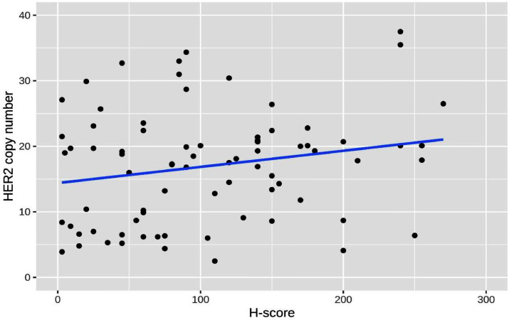 △HER2+病例中HER2基因拷贝数与pRb H分数之间的关系