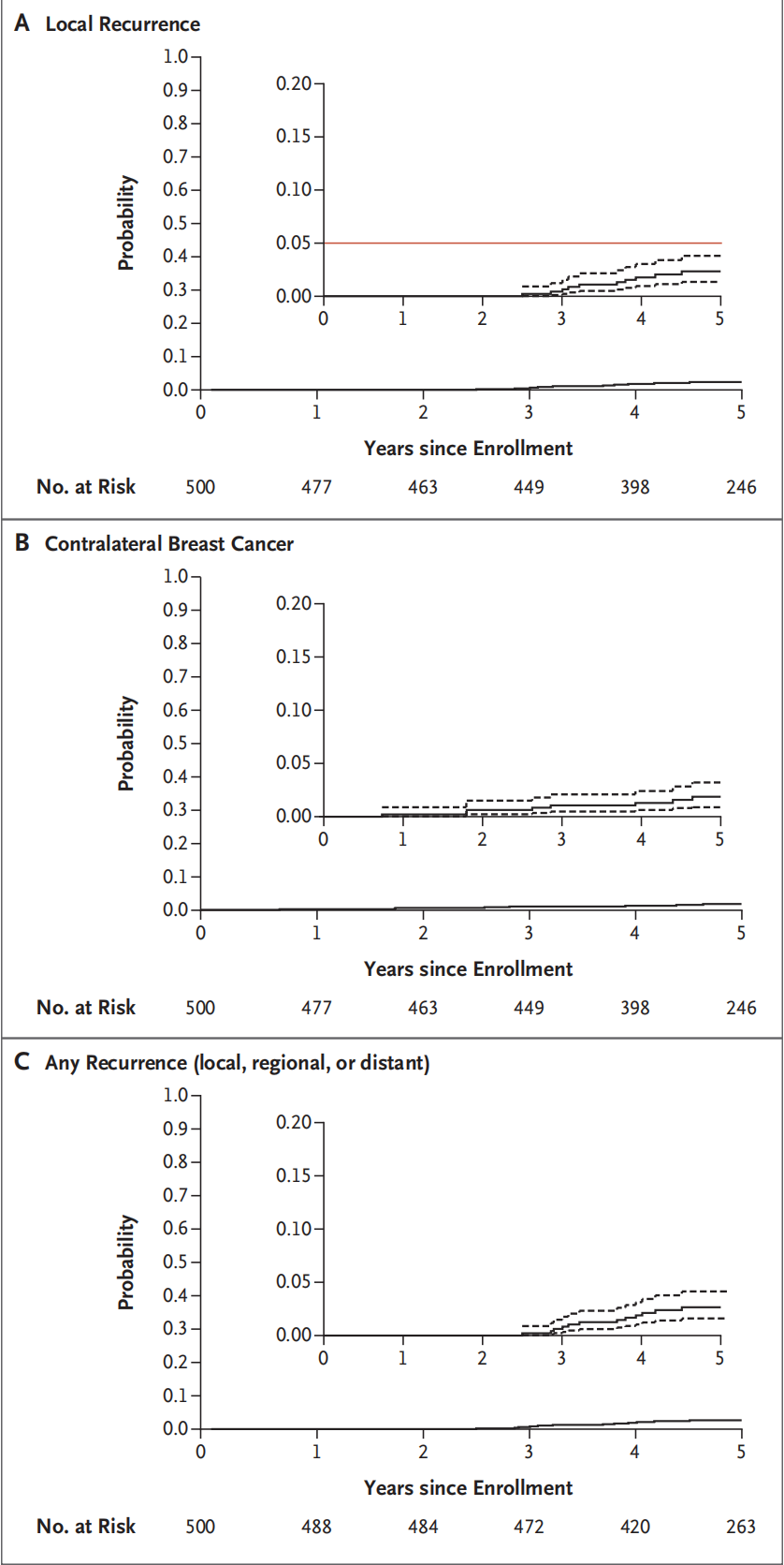 患者每6个月随访1次,持续2年,之后每年随访1次。每年还进行乳房X线检查。研究者在每次随访访视时通过与患者面谈评估了对内分泌治疗的依从性。主要结局是局部乳腺癌复发,定义为经组织学证实的同侧乳腺复发浸润性癌或原位癌,测量时间从纳入试验至记录到局部复发。如果局部复发发生在原瘤床2 cm以内,则描述为真实复发或边缘复发,或其他部位复发。次要结局包括对侧乳腺癌、任何复发(即同侧乳腺、区域淋巴结或远处部位的复发性疾病)、无病生存期(即从纳入试验至任何疾病复发、对侧乳腺癌、第二原发性非乳腺癌或死亡的时间)和总生存期。所有复发、第二原发癌和死亡均根据支持性文件进行独立裁定。与放射肿瘤科医生和乳腺癌患者协商后,研究者假设,如果5年时累积发生率的双侧90%置信区间上限小于5%,则5年时局部复发的风险是可以接受的。