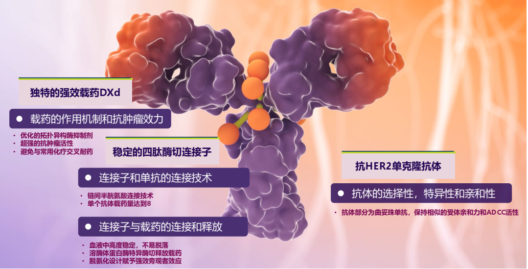 T-DXd由抗体部分曲妥珠单抗、细胞毒部分拓扑异构酶I抑制依喜替康甲磺酸盐(DXd)通过四肽的可裂解连接子偶联而成。其抗体部分与曲妥珠单抗氨基酸序列一致,与HER2蛋白的结合力和抗体依赖性细胞介导的细胞毒作用(ADCC)不受影响。其连接子部分为GGFG四肽可裂解连接子,疏水性低,在血液循环中保持稳定,DXd在血浆中21天的脱落率仅约2%;然而其在被肿瘤细胞内吞后,可通过溶酶体蛋白酶特异识别并切割释放细胞毒载荷,从而在机制上降低了脱靶毒性。其细胞毒载荷部分为DXd,抗肿瘤活性是伊立替康活性代谢产物SN-38的10倍,约为伊立替康的1000倍;高达8的DAR又进一步提高了T-DXd的抗肿瘤活性,在设计中采用的半胱氨酸偶联方式保证了DAR的高度均一;加之DXd与乳腺癌常用化疗药物机制不同,可有效避免交叉耐药。此外,由于DXd具有细胞膜渗透性,可渗透到肿瘤细胞外发挥旁观者效应,对靶细胞周围的肿瘤细胞也产生杀伤作用,有效克服肿瘤的异质性[5,6,7,8]。