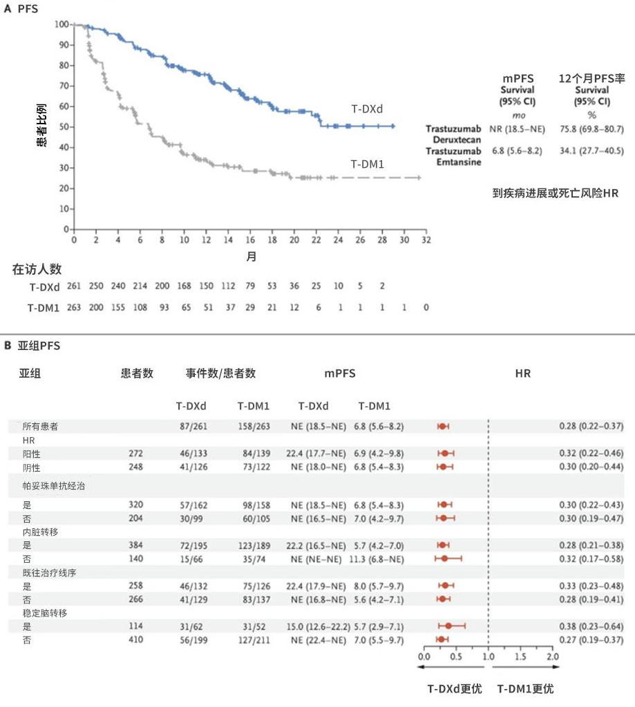 图6 ESMO及《NEJM》公布的DESTINY-Breast03研究初步结果