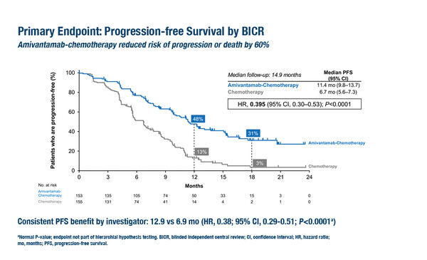 在2023年ESMO大会上公布的III期PAPILLON试验的初步结果显示,未经治疗的EGFR外显子20插入突变晚期NSCLC患者接受Amivantamab加化疗的中位无进展生存期(PFS)为11.4个月,而化疗组为6.7个月(风险比[HR] =0.395;95%置信区间[CI]: 0.30–0.53;p<0.0001)。