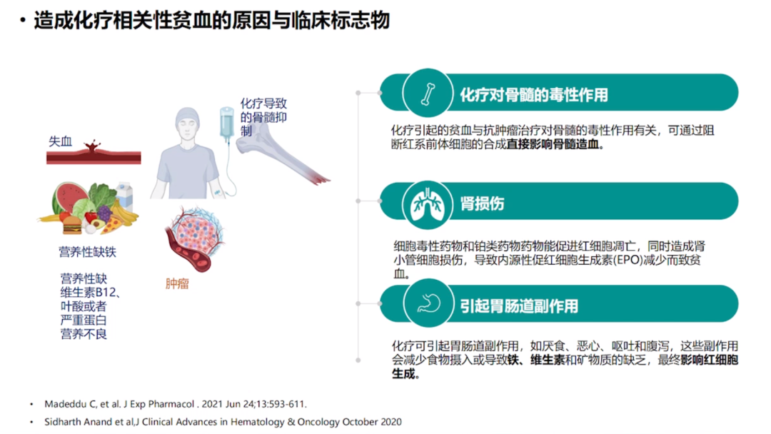肿瘤患者发生贫血的原因很多,包括失血、肿瘤进展、营养问题、化疗等。化疗可以通过作用于人体不同器官引发贫血,比如化疗的骨髓毒性直接影响骨髓造血;化疗导致的肾毒性会引起肾小管损伤致使内源性促红细胞生成素(EPO)分泌减少,从而抑制红系祖细胞分化;化疗引起的恶心、呕吐、厌食等会造成铁摄入减少,影响血红蛋白的生成和血细胞成熟[16,17]。