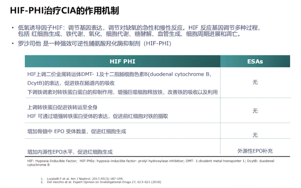 临床对新型改善贫血的药物期盼已久。全球首个可逆性低氧诱导因子-脯氨酰羟氧化酶抑制剂(HIF-PHI)罗沙司他可通过在机体不缺氧的条件下抑制HIF-PH活性,促进HIF累积,进而上调二价金属转运体DMT-1及十二指肠细胞色素B(DcytB)的表达,促进铁在肠道内的吸收,并下调铁调素,改善铁吸收及利用。HIF上调还可通过增强转铁蛋白受体表达,促进前红细胞对铁的摄取;并增加内源性EPO产生、增加骨髓中EPO受体数量,促进红细胞生存,对抗贫血,为临床提供了全新机制的选择策略。