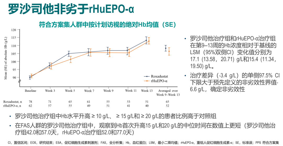 截至数据公布时,罗沙司他组78例,rHuEPO-α62例纳入分析。结果显示,两组从基线到第9-13周的平均Hb绝对值的表现几乎一致,罗沙司他略有优势趋势。第9-13周平均Hb值,罗沙司他组非劣于rHuEPO-α组,为17.1g/L vs 15.4g/L。在Hb恢复方面,罗沙司他组中Hb增加≥10g/L、≥15g/L和≥20g/L的患者比例更高;且罗沙司他组较rHuEPO-α组观察到Hb首次增加15 g/L(42.0天vs 52.0天)和20 g/L(57.0天vs 77.0天)的中位时间在数值上更短。在患者治疗体验及安全性方面,罗沙司他也更具优势。