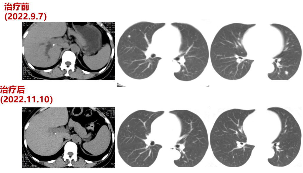 2022-09-07至2023-01-03院外使用DS-8201治疗5周期。2周期后疗效评价:PR。CT示:腹膜后淋巴结较前部分缩小;双肺多发转移灶较前缩小。