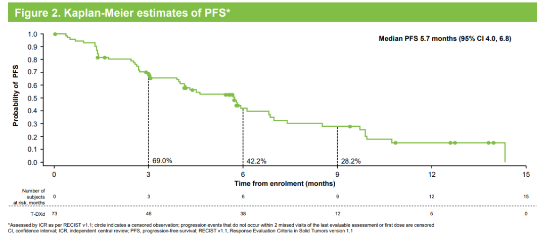 截至2023年6月16日,纳入95例患者(意向治疗人群,ITT),其中73例确诊为HER2阳性(IHC 3+或IHC 2+/ISH+;全分析集[FAS])。在FAS集中,65.8%的患者年龄在65岁以下,72.6%的患者为IHC 3+,30.1%的患者的原发肿瘤为食管癌。中位随访8个月,HER2阳性患者中,ICR评估的mPFS为5.7个月,mOS为10.2个月,ORR为28.8%,DCR为79.4%,mDOR为7.9个月。