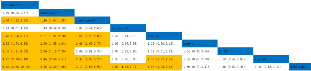 吡咯替尼+曲妥珠单抗联合化疗方案的疗效优于帕妥珠单抗+曲妥珠单抗联合化疗的疗效(OR=1.19,95%CI=0.85-1.67),但95%置信区间包含1,差异无统计学意义。(表2)
