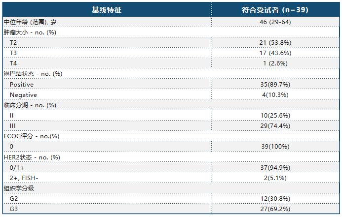 这项两阶段、前瞻性、多中心研究。在第一阶段入组39例既往未经治疗的II-III期TNBC患者。入组受试者接受试验药物进行新辅助治疗,包括6个周期的卡瑞利珠单抗(200mg,q3w),以及白蛋白紫杉醇(220mg/m2,q3w)和卡铂(AUC 5,q3w)。在第二阶段,入组患者以1:1的比例随机分配至卡瑞利珠单抗+白蛋白紫杉醇+卡铂组或白蛋白结紫杉醇+卡铂组。本次大会报道了研究第一阶段的数据。主要终点是总病理学完全缓解率(tpCR,ypT0/is ypN0)。次要终点包括乳腺病理学完全缓解率(bpCR,ypT0/is)、客观缓解率(ORR)、无事件生存期(EFS)和安全性。