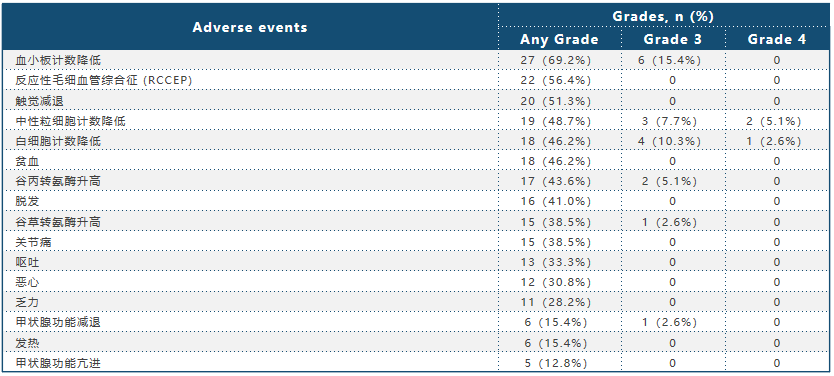 2021年9月至2023年3月期间,第一阶段共入组39例患者。39例中有35例淋巴结阳性,占89.7%,此外,还有1例尚未手术。研究结果显示,ITT人群tpCR率为57.9%(22/38),bpCR率为65.8%(25/38)。新辅助治疗结束时的ORR为87.2%(34/39)。在39例患者中,11例(28.2%)发生≥3级治疗相关不良事件,其中最常见的是血小板计数降低(6例[15.4%])、白细胞计数降低(5例[12.8%])、中性粒细胞计数降低(5例[12.8%])、丙氨酸氨基转移酶升高(2例[5.1%])、天门冬氨酸氨基转移酶升高(1例[2.6%])和甲状腺功能减退(1例[2.6%])。5例(12.8%)患者发生因药物不良反应导致的停药,7例(17.9%)患者发生治疗延迟。4例(10.4%)患者发生了治疗相关的严重不良事件。