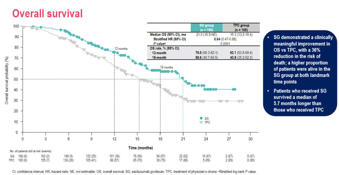 更难能可贵的是,关键的研究终点OS有5.7个月的提高(SG组和TPC组的mOS分别为21.0个月vs.15.3个月),对于晚期乳腺癌患者具有临床价值的总生存改善。