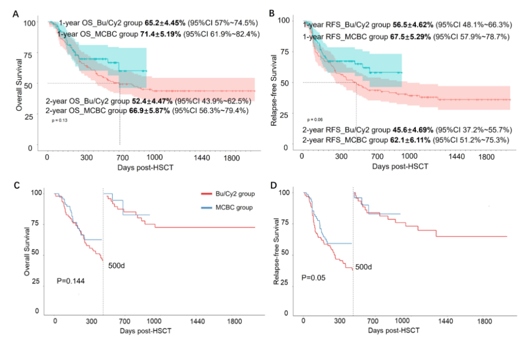 这项多中心MCBC试验前瞻性地纳入了89例R/R AML患者,中位年龄36岁(11~59岁)。仅39.33%(35/89)的患者在HSCT时达到血液学缓解。单倍体相合HSCT(HID-HSCT)是(n=62,69.67%)是HSCT的主要类型。黏膜炎是发生率较高的预处理相关不良反应(65.17%),但多为轻度且耐受性良好。所有患者在移植后均获得血液学完全缓解(CR)(100%),且在造血重建日微小残留病(MRD)清除率达到85.39%,表明MCBC方案具有良好的抗白血病能力。Ⅱ~Ⅳ度急性GVHD发生率为50.56%,其中重度aGVHD(Ⅲ~Ⅳ)发生率仅为8.99%。MCBC组与Bu/Cy2组在年龄、性别、疾病状态等基线信息相似。MCBC组中位随访时间为431.29天(95%CI:437.34~570.65),Bu/Cy2组中位随访时间为1236天(95%CI:1169.32~1302.68)。MCBC组和Bu/Cy2组患者的估计1年总生存率(OS)、无复发生存率(RFS)分别为(71.4±5.19)%vs.(65.2±4.45)%(P=0.13)、(67.5±5.29)%vs.(56.2±4.62)%(P=0.06)。值得注意的是,MCBC组的生存优势在估计的两年数据中得到了扩大:两组估计2年OS、RFS分别为(66.9±5.87)%vs.(52.4±4.47)%、(62.1±6.11)%vs.(45.6±4.69)%。我们进一步进行了标志性生存分析(landmark analysis),结果显示,与Bu/Cy2组相比,MCBC组移植后500天内具有无复发生存优势(P=0.05)。