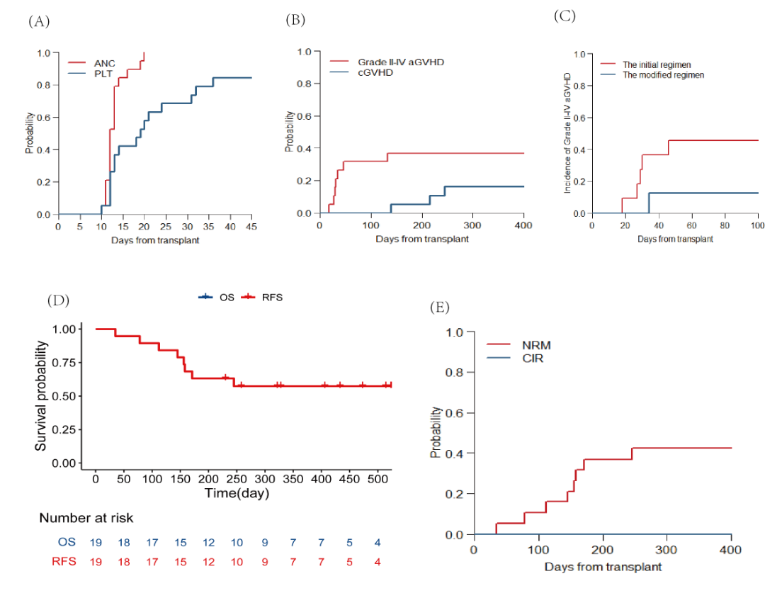 在整个队列中,6个月总生存率(OS)和无复发生存率(RFS)分别为63%(95%CI:45~89)和63%(95%CI:45~89)。6个月非复发死亡率(NRM)为37%(95%CI:16~58),而累积复发率(CIR)为0。100天II~IV级急性移植物抗宿主疾病(aGVHD)和III~IV级aGVHD的发生率分别为31%(95%CI:12~53)和26%(95%CI:9~47)。结果表明该方案的III~IV度aGVHD发生率相对较高,因此不适合老年患者使用。因此,需要进一步开展高质量的研究,以改进确诊为髓系肿瘤的高风险老年患者的治疗方案。