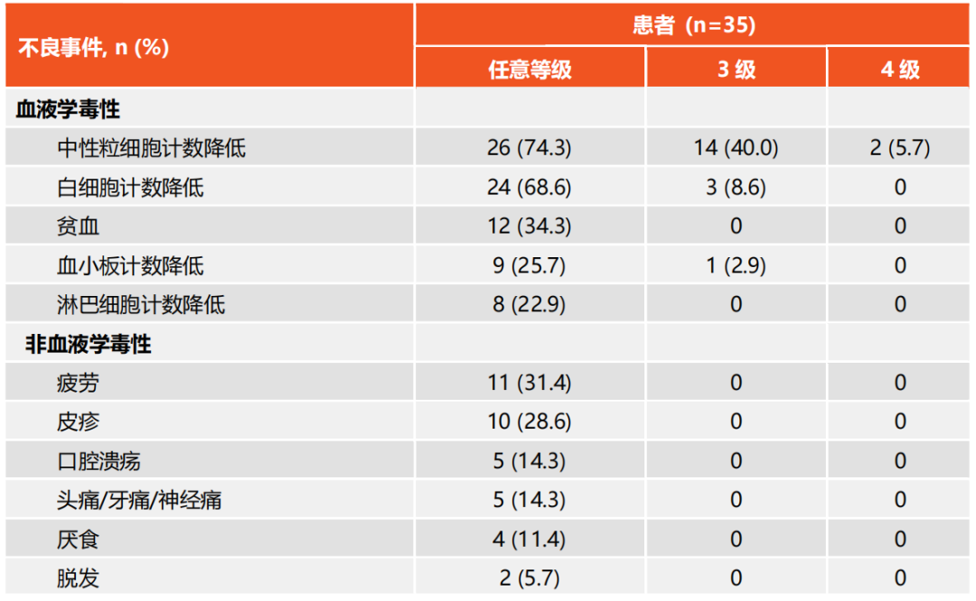 在所有35例患者中,最常见的副作用是中性粒细胞减少(74.3%)、白细胞减少(68.6%)、贫血(34.3%)和疲劳(31.4%)。而最常见的3级或以上不良事件是中性粒细胞减少(45.7%)。期间未发生热性中性粒细胞减少症或与治疗有关的死亡事件。