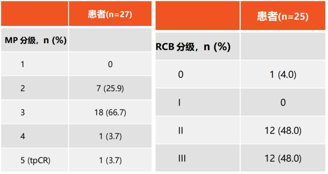 需要注意的是,尽管研究治疗时长只有4个周期(16周),在经评估的患者中,8周时的客观缓解率(ORR)为35.5%(11/31),16周时的ORR达到51.7%(15/29)。共有30例患者在药物治疗的第15天进行了空芯针穿刺活检,根据Ki-67的表达,计算出CCCA率达70.0%(21/30),这也是非常不错的结果。有4例患者选择拒绝手术(实际上这4例患者是因为对新辅助治疗效果较满意,均达到PR,才选择继续药物治疗)。在进行手术的27例患者中,有1例(占3.7%)达到了tpCR和RCB 0级。