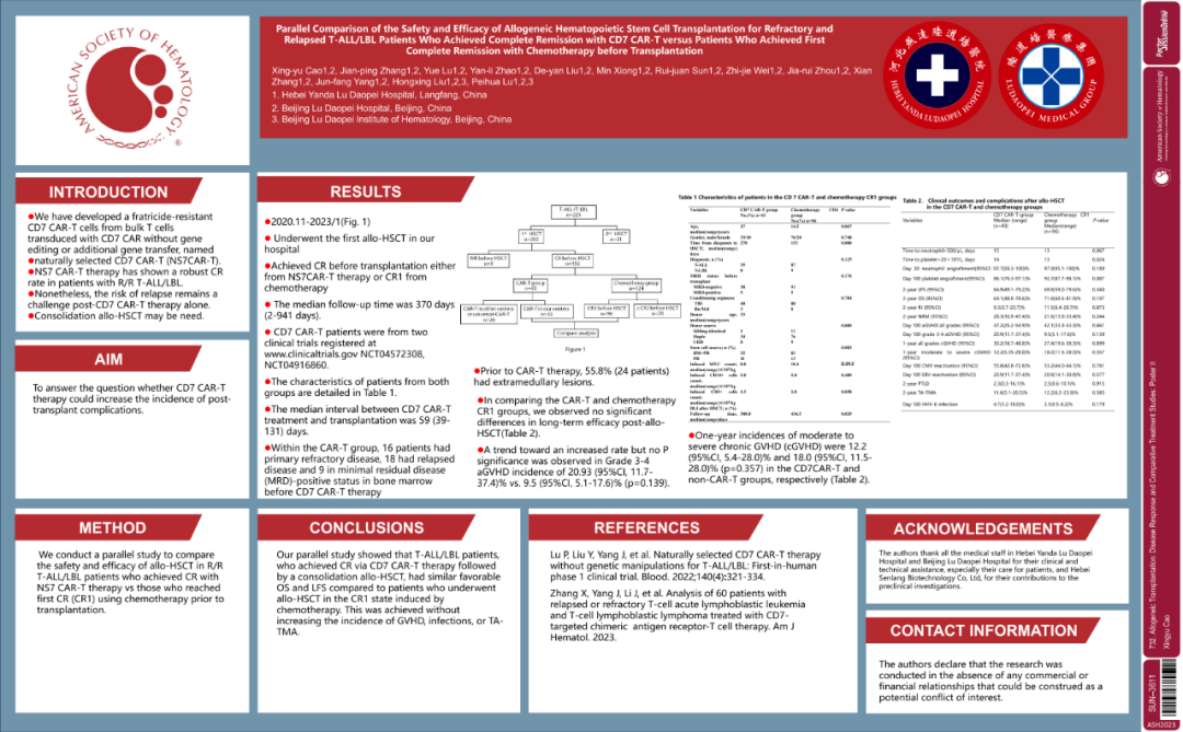 我们的研究显示,R/R的T-ALL/LBL患者通过CD7 CAR-T获得缓解后做allo-HSCT可以获得和通过化疗在CR1做allo-HSCT的相似OS和LFS。同时并没有增加GVHD、感染和TA-TMA的发生率。